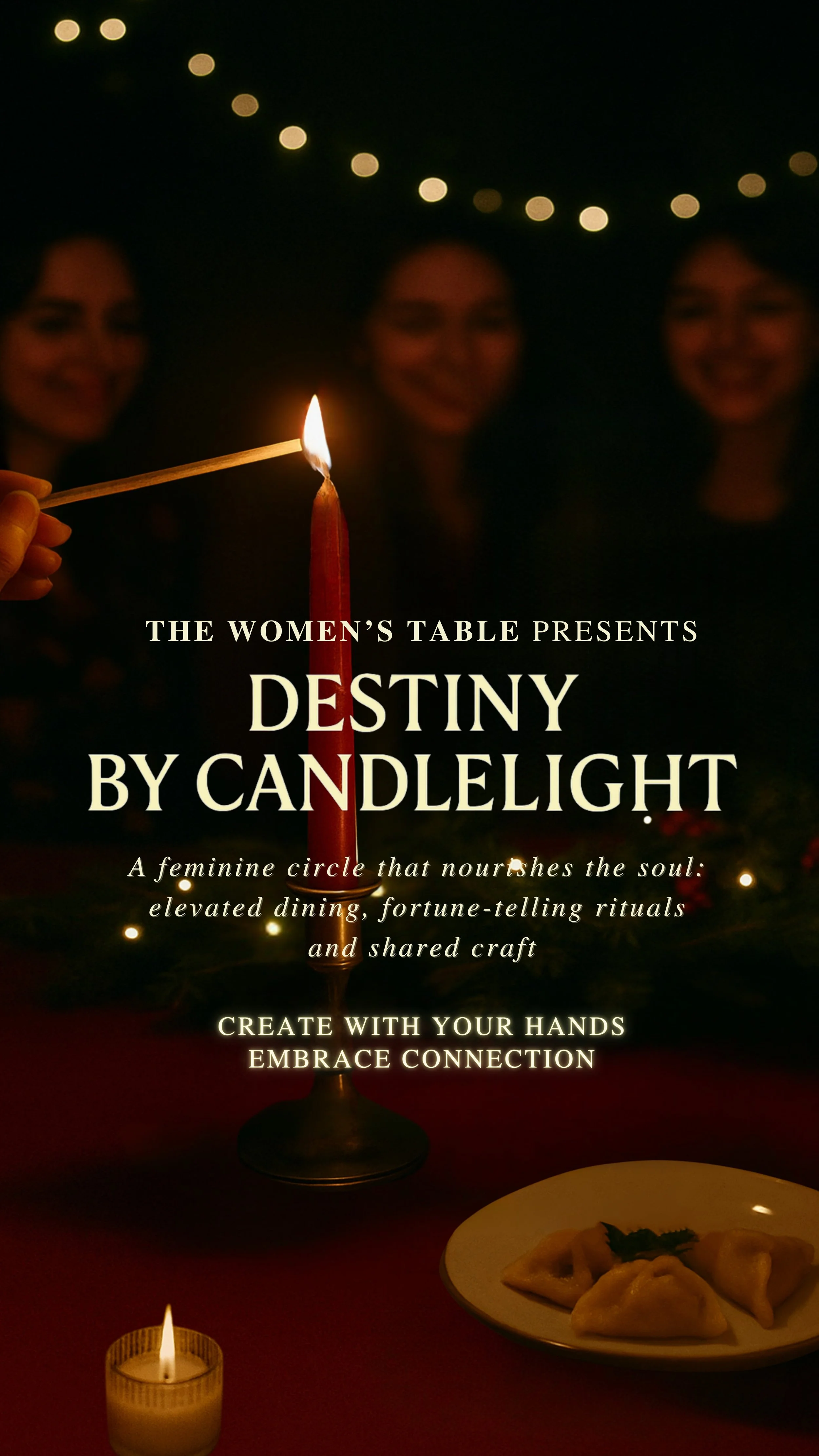 Destiny by Candlelight is an evening designed for women to connect over an elevated dining experience, hands-on candle-making, and interactive fortune-telling rituals. Expect a welcoming atmosphere, meaningful conversations, and a chance to meet new people while sharing food, craft, and energy.